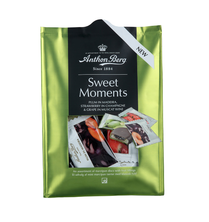 Wersja z miniaturyzowana jednego z najbardziej znanych produktów firmy Anthon Berg (owoców w marcepanie z alkoholem). Torebka zawiera pakowane pojedynczo marcepanowe krążki w polewie z deserowej czekolady, wypełnione musem w trzech wersjach smakowych- winogron z muskatem, śliwek z madeirą oraz truskawek z szampanem. W ofercie posiadamy także większe wersje smakowe marcepanów firmy Anthon Berg. Gramatura 165g.
