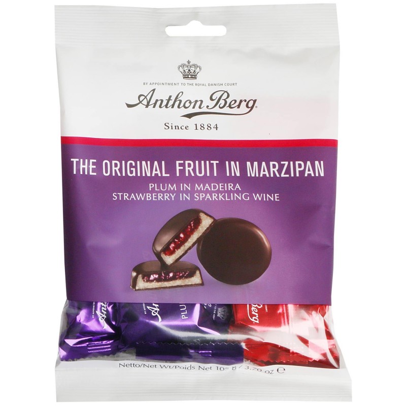 Marzepan w polewie z gorzkiej czekolady z owocowym wypełnieniem.