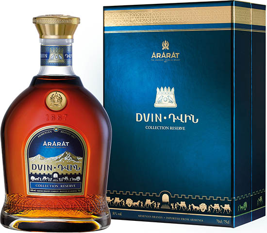 Wspaniała dziesięcioletnia brandy Dvin jest pierwszym arcydziełem Ekskluzywnej Kolekcji ArArAt, stworzonym w 1945 roku przez Markara Sedrakyana, mistrza w mieszaniu firmy Yerevan Brandy. W ciągu swojej historii, Dvin otrzymała wiele nagród, w tym 13 złotych medali w międzynarodowych konkursach. Pięćdziesięcioprocentowa Dvin stała się ulubionym trunkiem brytyjskiego premiera – Winstona Churchilla. Po raz pierwszy kosztował jej podczas spotkania ze Stalinem i Rooseveltem w Jałcie. Następnie, na rozkaz Stalina, Churchill co miesiąc otrzymywał dostawę brandy Dvin. Do końca swoich dni, premier był oddanym wielbicielem tego legendarnego ormiańskiego trunku, gdyż Dvin to napój dla prawdziwych koneserów, którzy potrafią docenić wyjątkowe cechy wspaniałej brandy. W 2011 roku, ArArAt wznowił produkcję swojego dzieła w nowym opakowaniu. Legendarna mieszanka nazwana na cześć legendarnej średniowiecznej stolicy Armenii, Dvin jest ucieleśnieniem nowego jasnego i współczesnego obrazu. Korona Arshakids reprezentuje nowy symbol, dynastię panującą w najbardziej pomyślnym okresie brandy Dvin. Karawany kupieckie stanowiły przypomnienie kilku wieków, kiedy to Dvin było kluczowym ośrodkiem handlowym na Wielkim Jedwabnym Szlaku i jednym z największych miast w orientalnym świecie, znanym z niesamowitego luksusu. Dziedzictwo i bogactwo średniowiecznego miasta znajduje odzwierciedlenie we wspaniałości i zamożności tego wyjątkowego trunku. Wiek: 10 lat. Zawartość alkoholu – 50%. Zapach i smak – dzięki wyjątkowo długiemu okresowi dojrzewania w dębowych beczkach, Dvin zyskuje bogaty bursztynowy kolor z niuansami głębokiego mahoniu. Subtelny aromat goździków idealnie równoważy się z nutami suszonych owoców, a jasne zabarwienie orzechów leśnych ukazuje pikantny, bogaty smak tej brandy.