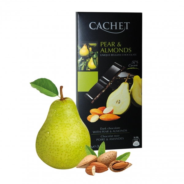 Składniki: masa kakaowa, migdały 8%, kawałki gruszki (inulina, proszek gruszkowy 5%, naturalny aromat) 3,50%, masło kakaowe, bezwodny tłuszcz mlekowy, emulgator: lecytyna sojowa
