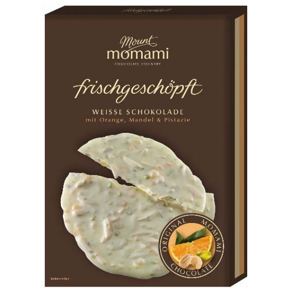 Wyjątkowe połączenie białej recznie robionej czekolady z kawałkami pomarańczy, migdałów i pistacji.