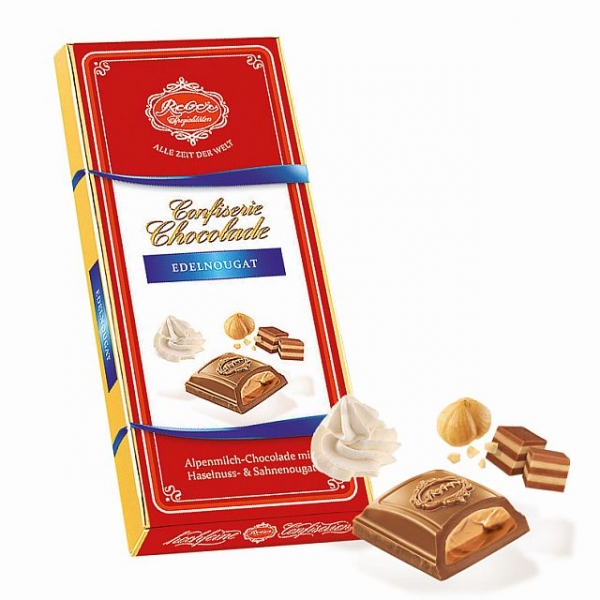 Mleczna czekolada alpejska (72%) z nugatem z orzechów laskowych (18%) i z nadzieniem kremowo – nugatowym (10%)