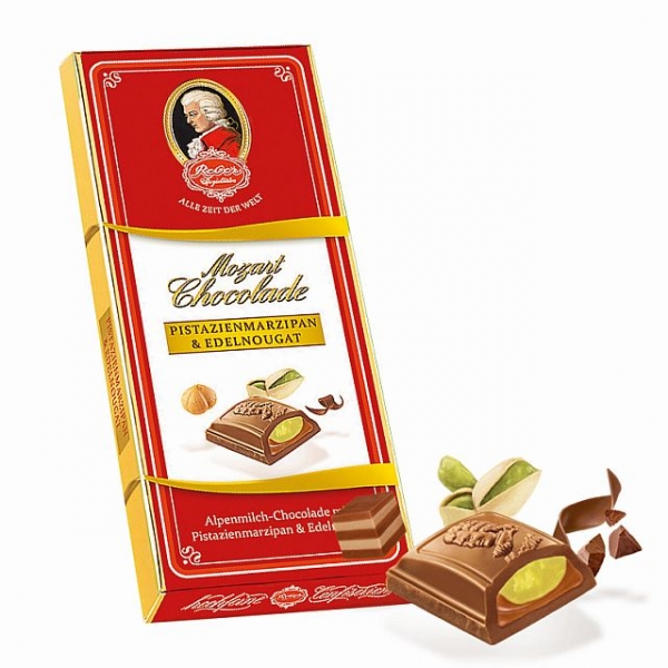 Mleczna czekolada (72%) z nadzieniem orzechowo – nugatowym (18%) i pistacjowym (10%)