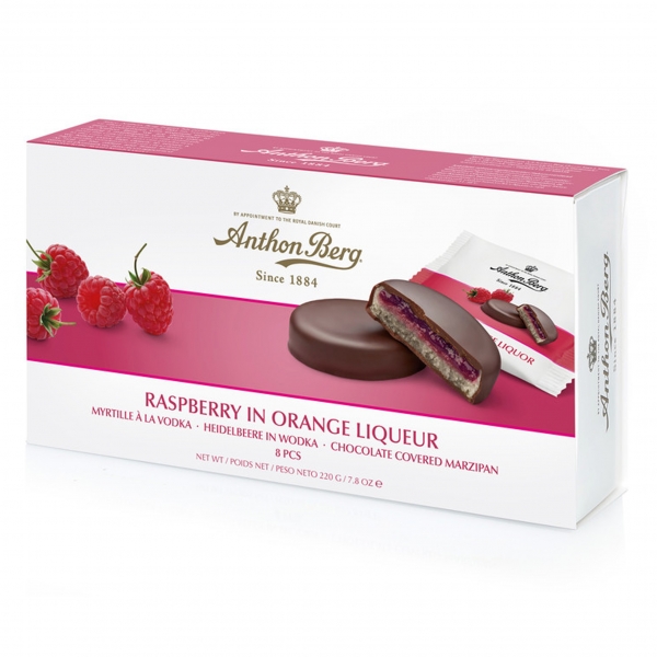 Czekolada z marcepanem (42%) i nadzieniem (25%) z malin w likierze pomarańczowym.