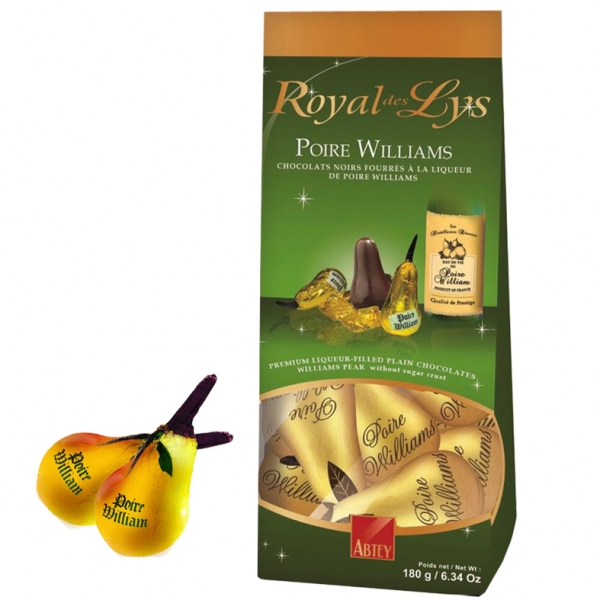 Składniki: cukier, masa kakaowa, inwertowany cukier, masło kakaowe, William gruszka brandy (3,78%), alkohol, aromat (gruszka, wanilina), emulgator: lecytyna sojowa