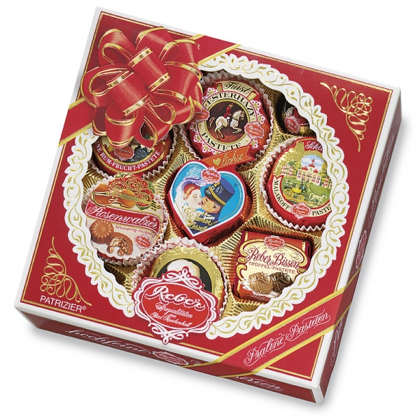 Składniki: cukier, migdały, tłuszcz kakaowy, masa kakaowa, orzechy, mleko pełne w proszku, rodzynki, śmietana, tłuszcz roślinny, chrupki ryżowe (mąka ryżowa, cukier , sól), pistacje, miód, skórka pomarańczowa, olej masło, cukier mleczny, brandy, ananas, kakao w proszku, substancja utrzymująca wilgoć: inwertaza, żółtko jaj w proszku, białko jaj, emulgator: lecytyna sojowa, substancje smakowe, wiśnie, rum, utwardzony tłuszcz roślinny, alkohol, tłuszcz słonecznikowy, cytryna. Wafel (mąka pszenna, olej roślinny, cukier, mleko w proszku, skrobia pszenna, rozpuszczalne białko roślinne (soja), sól, substancje zapachowe, środki spulchniające: wodorowęglan sodu.
