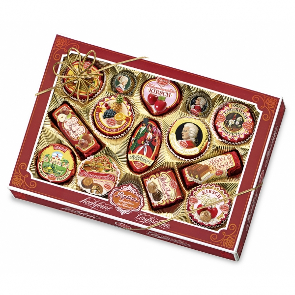 Składniki: cukier, migdały, tłuszcz kakaowy, masa kakaowa, orzechy, mleko pełne w proszku, rodzynki, wiśnie, ananas, śmietana, masło, pistacje , kandyzowane skórki pomarańczy, miód, cukier mleczny, chrupki ryżowe (mąka ryżowa, cukier, sól), dżem wiśniowy, syrop glukozowo-fruktozowy, tłuszcz roślinny, śmietanka w proszku, substancja utrzymująca wilgoć: inwertaza, kakao w proszku, alkohol, brandy, emulgator: lecytyna sojowa, białko jaja (suchy proszek), żółtko jaja w proszku , utwardzony tłuszcz roślinny, cherry brandy, rum, aromat, środek zakwaszający: kwas cytrynowy. Wafle, opłatki: (mąka pszenna, cukier, skrobia pszenna, olej roślinny, krem, proszek żółtka jaja, sól, substancje zapachowe, środki spulchniające: wodorowęglan sodu)