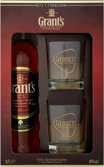 12 letni Grant’s w eleganckim zestawie z firmowymi szklankami do whisky.